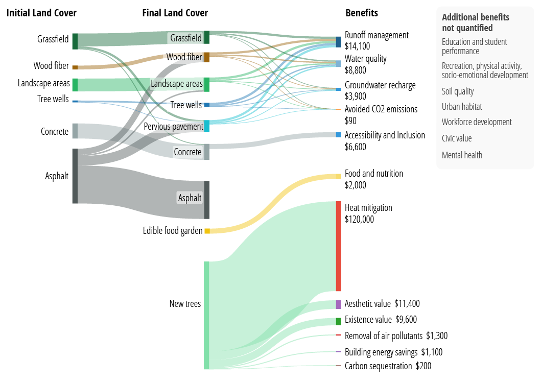 Students and teachers share benefits of $128,404 each year, mostly from the ability of newly planted trees to mitigate temperature extremes (reducing health impacts), but also by improved compliance with ADA regulations and fresh foods provided by the school’s new garden.