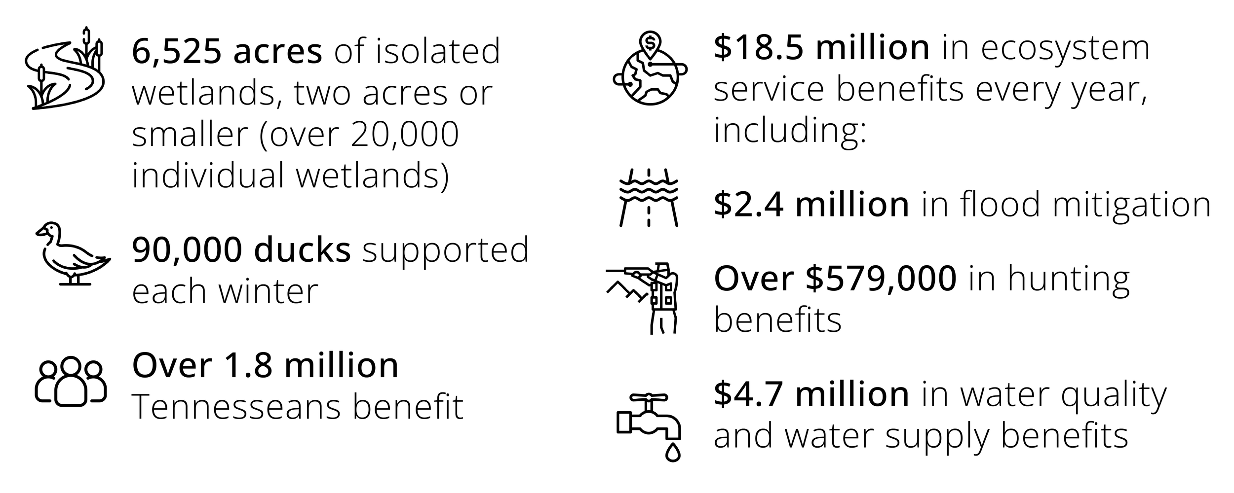 The 6,525 acres of small, isolated wetlands (two acres or smaller) in the Duck River watershed provide $18.5 million in benefits for over 1.8 million Tennessee residents every year.