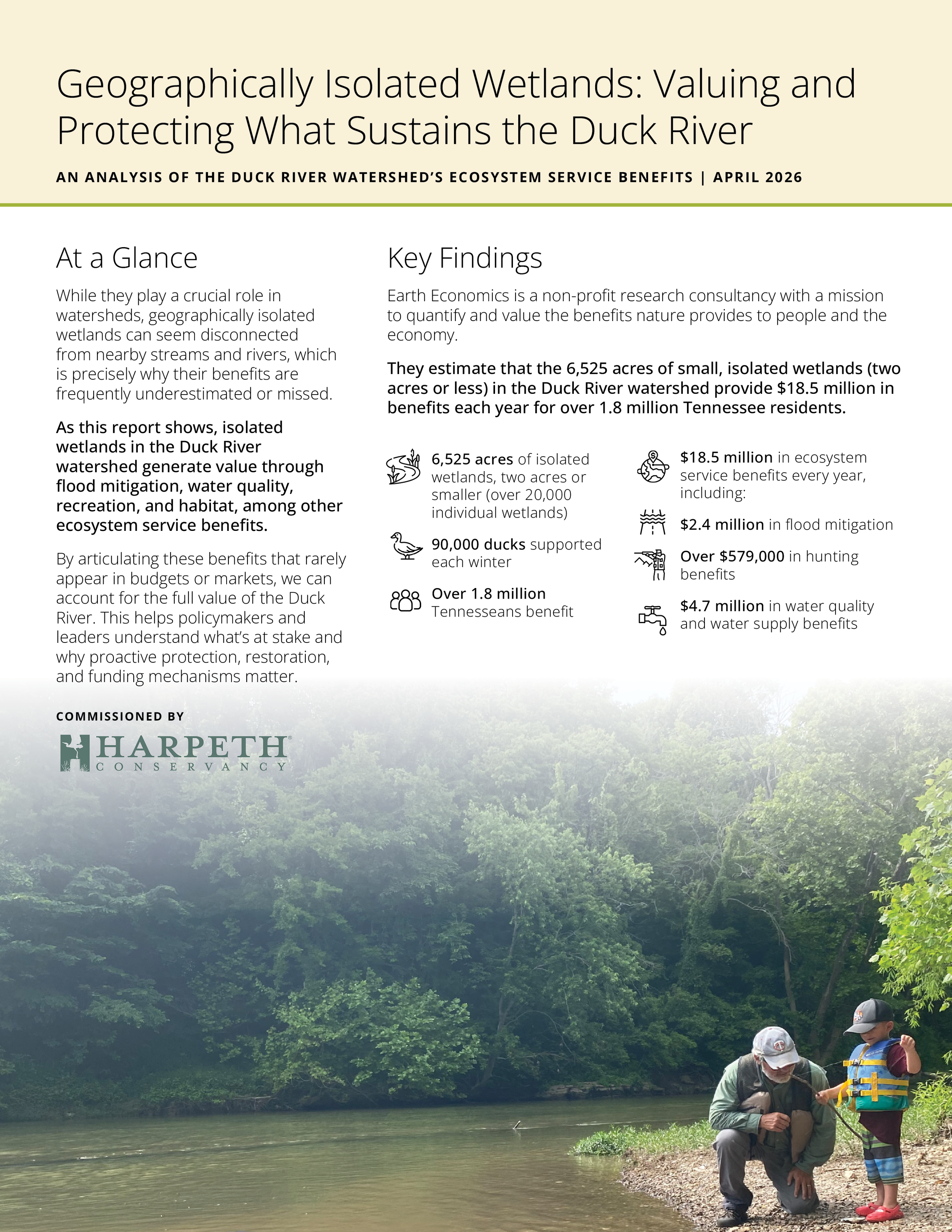 Following rollbacks of wetland protections in 2026, Harpeth Conservancy wanted to inform state‑level watershed planning and financing strategies about the economic value of ecosystem services provided by isolated wetlands across the Duck River basin.
